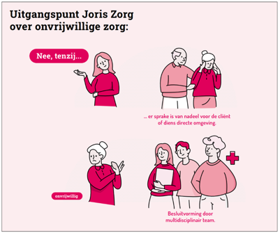 MedicatieveiligheidJoris Zorg werkt volgens de landelijke richtlijnen veilige principes in de medicatieketen. Daarvoor zijn afspraken gemaakt met onder andere de apotheker en medisch behandelaren. Joris Zorg werkt met een geneesmiddelencommissie; hierin zitten een voorschrijvend behandelaar van Novicare, de regieapotheker, een regieverpleegkundige en de beleidsadviseur. In deze commissie worden lopende zaken besproken, komen knelpunten vanuit de locaties naar voren en is aandacht voor de medicatiegerelateerde MIC-meldingen: wat speelt er, wat wordt eraan gedaan, wat is het resultaat van de acties en moeten de plannen worden bijgesteld? MIC en MIPJoris Zorg heeft de taken voor de MIC (melding incident cliënten) commissie belegd bij de regiegroep kwaliteit. Hierin zitten een specialist ouderengeneeskunde, beide regieverpleegkundigen , een zorgbemiddelaar, een manager zorg en de beleidsadviseur. Doelstelling is het analyseren van meldingen en deze vertalen naar adviezen en verbeterpunten in processen. Het gaat om het toetsen van de kwaliteit van zorg in de organisatie aan de hand van de analyse van de geregistreerde (bijna) incidenten en (bijna) fouten in de zorg. Hiermee kunnen vermijdbare oorzaken die tot fouten hebben geleid, in de toekomst voorkomen worden. Op iedere locatie draagt de kwaliteitsverpleegkundige verantwoordelijkheid voor zorg en risicosignalering voor cliënten en houdt mede daardoor zicht op kwaliteit van zorg in het team. De kwaliteitsverpleegkundige is teamgericht verantwoordelijk voor de kwaliteit en veiligheid van zorg, bewaakt, signaleert, ondersteunt en adviseert het team daarbij en is het eerste aanspreekpunt voor het team. De kwaliteitsverpleegkundige maakt (eventueel met een medewerker uit het team) aan de hand van de door de regieverpleegkundige gemaakte kwartaalrapportages, analyses en adviezen een verbeterplan voor het eigen team. De managers houden toezicht op de uitvoering hiervan. In 2026 evalueren en actualiseren we deze werkwijzen. Daarnaast werken we met MIP (meldingen incidenten personeel). Deze meldingen komen bij de teamleider, die de meldingen direct oppakt. De manager heeft een bewakende rol m.b.t. opvolgen van de meldingen. De Arbo adviseur kijkt overstijgend of er op organisatieniveau onderwerpen opgepakt moeten worden. In 2025 waren er 64 meldingen (en in 2024 waren er 78). Omgaan met onbegrepen gedragBij cliënten met dementie of een andere ziekte met cognitieve stoornis, kan probleemgedrag voorkomen. Al proberen we dit, door zo goed mogelijk aan te sluiten bij de cliënt, zoveel mogelijk te voorkomen. Het is belangrijk de oorsprong van het probleemgedrag te begrijpen. Hierbij is een objectieve kijk van belang. In sommige situaties is het preventief werken niet voldoende en het voorkomen van probleemgedrag niet haalbaar. Probleemgedrag bij mensen met dementie wordt bepaald door meerdere factoren. Dit vraagt om een multidisciplinaire aanpak (stepped care) door professionals met ieder hun specifieke deskundigheid (psycholoog, medisch behandelaar, gedragsondersteuner, gespecialiseerd verzorgende psychogeriatrie/somatiek en andere medewerkers en verwanten) - onder andere met behulp van de gedragsvisite. Waar nodig consulteren we het CCE (Centrum Consultatie en Expertise) voor ondersteuning. Het besluitvormingsproces van alle maatregelen, inclusief de overwogen alternatieven, wordt transparant en toetsbaar vastgelegd in het ECD. |